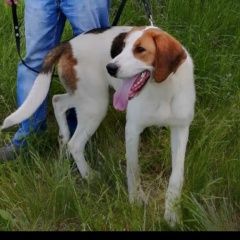 Русская пегая гончая по кличке Шумка. На ней ошейник с номером телефона хозяина.. Ирина, Виктор