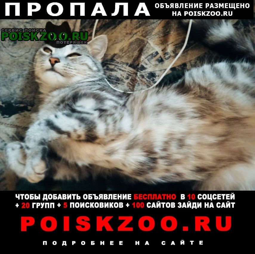 окрас серый в полоску, глаза жёлто-зелёные, нос оранжевый, подбородок белый, нашедшего прошу вернуть за вознаграждение, обращаться по тел..