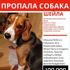 ПРОПАЛА СОБАКА ШЕЙЛА, 3 года. Эстонская гончая, похожа на бигля. Стерилизована. Окрас КОРИЧНЕВО-ЧЕРНЫЙ, БЕЛАЯ ГРУДЬ, ХВОСТ И ЛАПКИ. Сбежала 19. 04. 22 с участка в с. Никулино(Раменский район), рядом с Ромашково 37( Подмосковье), за Бронницами. Просьба, если увидите похожую, позвоните Собака очень дорога Вознаграждение