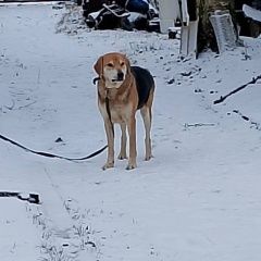 Русская гончая, мальчик. Прибился ещё летом в районе Макарово-Черноголовка Ногинский район. Очень добрый, общительный. Видно там где раньше жил его очень любили. Есть клеймо, но по нему след потерялся. Ищу хозяина или информацию об отказе. Тогда буду пристраивать.