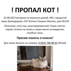 Здравствуйте Пропал кот Городской округ Домодедово, просим помочь с поиском Для связи.. (Юлия)