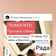 2 июля 2021  11696  1498 Пропала собака Электрогорск (Москва и Московская обл.)
