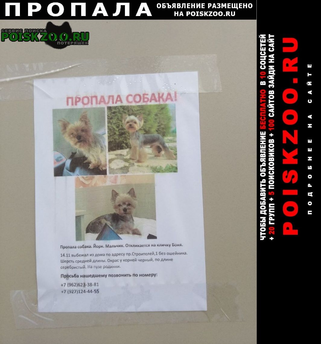 Пропала собака. Йорк. Мальчик. Откликается на имя Боня. 14. 11 выбежал из дома по адресу пр. Строителей 1, без ошейника. Шерсть средней длины. Окрас у корней - черный, по длине - серебристый. На пузе родинки.