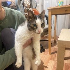 Найден кот/кошка, бело-серый окрас с коричневыми вкраплениями, по виду домашний и очень ласковый