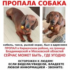 ПРОПАЛА СОБАКА МОЖЕТ НАХОДИТЬСЯ, ГДЕ УГОДНО Граница Владимирской и Московской областей, СНТ Шувалово, Киржачский район 18 сентября с дачного участка пропала такса, кобель, возраст 3 года. Окрас рыжий. Был в  ошейнике с адресником, есть клеймо. Очень умный, доброжелательный пёс. Пугливый, к чужим людям может не подойти. Его могли подобрать и увезти в любом направлении. Может удерживаться чужими людьми. Пожалуйста, поделитесь информацией в своих районных/локальных чатах и группах, чтобы как можно больше людей узнали о поиске Если видели или увидите собаку, пожалуйста, придержите либо сразу звоните Нашедшему гарантировано вознаграждение. Чат поиска https://t. me/+OFiMPa29DCozNzRi ПОМОГИТЕ РЕПОСТОМ