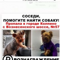 Продолжаем интенсивный поиск Люди- Друзья Помогите найти мою пропавшую малышку Уважаемые жители Колпино Колпинского района СПб и ЛО 01. 01. 25г от дома по Вознесенскому ш 57 с3 в Колпино, испугалась и убежала и бесследно пропала собачка, девочка, Йорк, кличка Ева Была новогодняя ночь, собачка оказалась на улице в это время случайно, мы не шли на салют Могли подобрать люди и решили оставить себе, могли подобрать и перепродать, могли передать в приют или на передержку Люди подобравшие Еву - отзовитесь Верните мне мою девочку Оплачу содержание и уход за малышкой Если кто видел ее или знает местонахождение прошу сообщить в личку или по т..Елена .. Анна