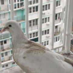 Среди домов летает белый голубь с коричневатыми перышками на грудке, спинке и на хвосте, на лапках колечки. В руки не дается. Возможно, потеряшка улетевший из голубятник или какой-нибудь свадебный голубь.