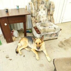 Прибилась овчарка, на ошейнике написано имя Джина, отзывается на имя. Все команды знает и исполняет. Молодая, ласковая.