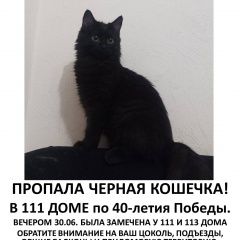 Пропала чёрная годовалая кошечка. Упала с балкона в районе Восточно-Кругликовской/40 летия - Победы 30. 06. 23. Несколько раз жители видели её а районе 111, 133 дома по 40-летию Победы, очень напугана.