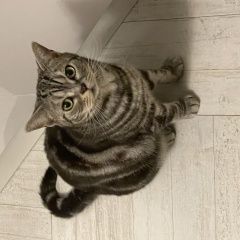 Кличка: Кэти Порода: Американская короткошерстная Окрас: черно-серый, полосатый Цвет глаз: зеленый Возраст: 7 лет Без ошейника( Домашняя кошка, немного пугливая. Выпала с карниза Имя хозяина: Дмитрий Телефон:..