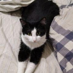 Сбежал кот. Среднекрупный, пушистый кастирован, зовут Сеня Окрас фрак, лапы до локтей белые Москва м. Первомайская ул 7 парковая