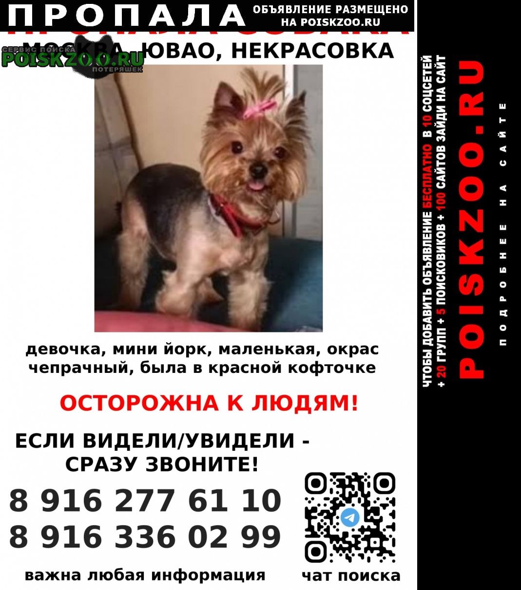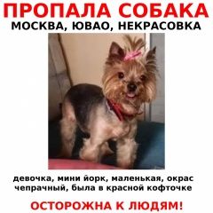 ПОТЕРЯЛАСЬ СОБАКА На прогулке в ночь с 03. 11-04. 11. 2025 ЮВАО, Некрасовка, ул. Покровская д35 чат поиска: https://t. me/+C9iFzEzIL49mZDAy Йоркширский терьер, йорк, девочка, мини, кличка Эви, красная кофта, ошейник, на голове хвост с розовой резинкой К ЛЮДЯМ ОСТОРОЖНА Если увидели, сразу звоните Сделайте фото/видео Держите в поле зрения Контакты:.. Михей.. Татьяна Тг: @VergilspardeV1ch Помогите репостами