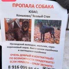 Ирландский волкодав. Очень добрый и контактный. По возможности придержите. Если просто увидели - сразу позвоните Мальчик, серо-коричневый окрас. Был в синем ошейнике и светящемся ошейнике.