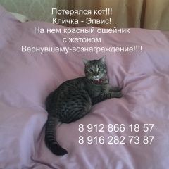 17 января в деревне Немчиново (Сколковское шоссе, ул Дачная) пропал кот. Окрас: серый с черными пятнами, пузо светлое, кончик хвоста черный, подбородок белый. Кот миниатюрный, на коте красный лаковый ошейник с камушками. Вернувшему - вознаграждение гарантировано