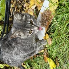 Найден котик, серый, видно домашний. Сидит в кустах между домами Вокзальная 37 и Толубко 1к4.