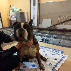 Найден пёс, мальчик, крупный бульдог, возраст ориентировочно 5-7 лет. Окрас средне-коричневый, мордочка чёрная с белыми пятнами. Пёс контактный и ласковый.