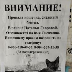 Пропала кошечка, снежный бенгал. В районе Натальи лавровой. Откликается на имя Снежанна. Нашедшего просим позвонить по телефону., .. За вознаграждение.