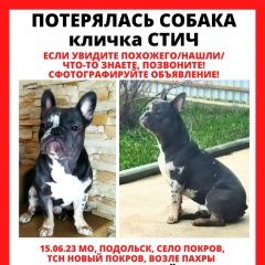Пропала собака французский бульдог кобель окрас голубой мерль кличка Стич, пропал в районе села Покров, ТСН Новый Покров возле Пахры, большая просьба кто видел позвонить и сообщить, тел.. Наталья
