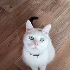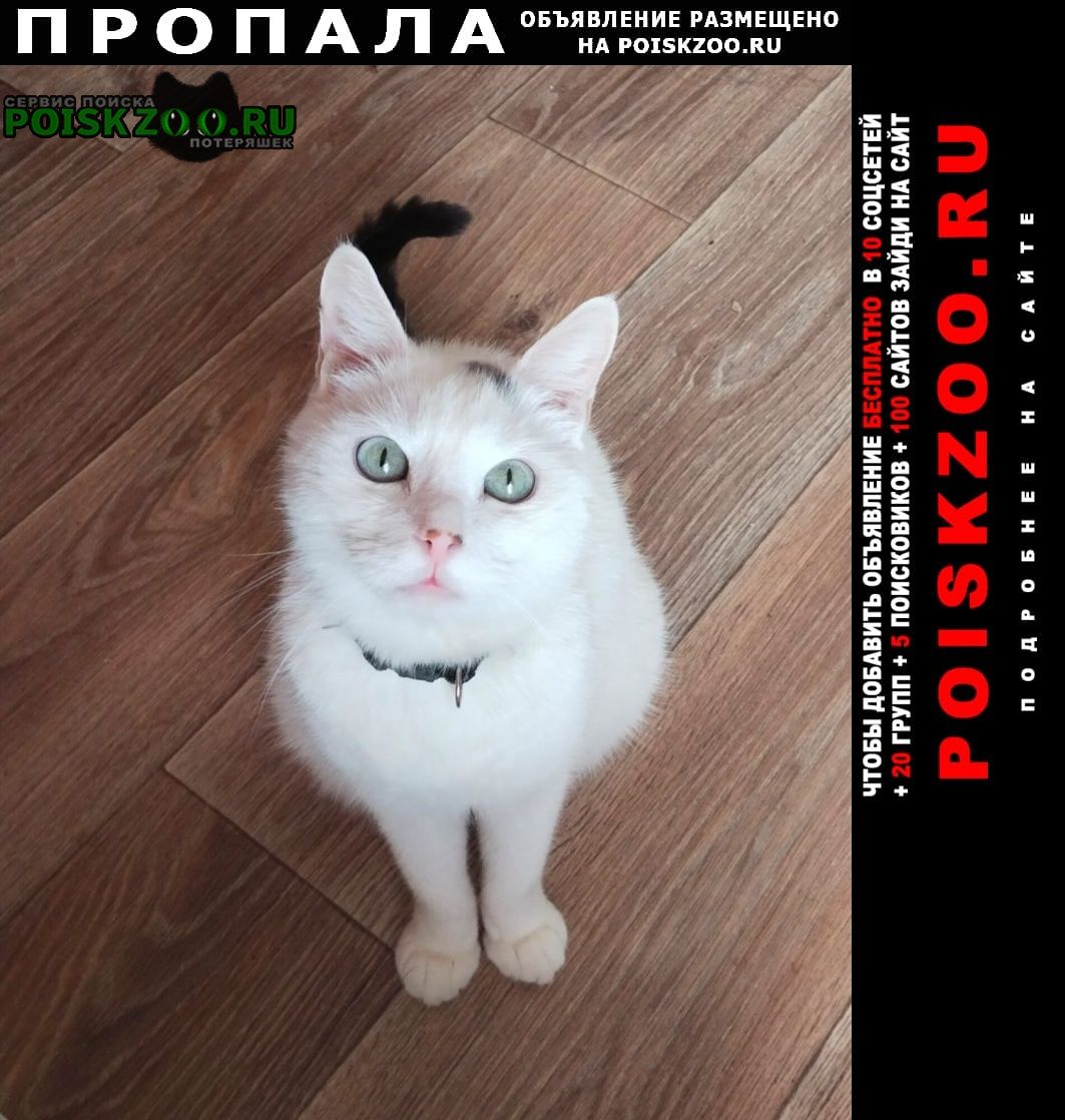 Пропал кот, белый, хвост серый, глаза голубые, несколько серых пятен на голове, спине. На нем был чёрный ошейник. Зовут Тимоша