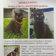 ПРОПАЛ КОТ 15 августа 2023 г. рано утром в районе шоссе Петергофское д. 84 корпус 15 пропал кот (предположительно выпрыгнул с балкона 1 этажа). Окрас - темно коричневый, гладкошерстный. Цвет глаз - зелено-желтый. Особые приметы - длинные уши, чипирован. Характер - очень добрый, не кусается, может быть сильно напуган. Возраст - 1, 8 лет.