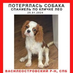 Василеостровский район, СПб. Потерялась собака Кинг-чарльз-спаниель, по кличке Лео мальчик, щенок. Убежал с прогулки 25. 01. 2024г. Потерялся в районе 5-й линии Васильевского острова, д. 46, ориентир зоомагазин Вака. За достоверную информацию о местонахождении Лео гарантируем вознаграждение 10 000 рублей и анонимность. Очень контактный, добрый.   Нам очень нужна помощь людей Если вы живёте рядом, можете выйти хоть на полчаса на прочёс или хоть просто из окна посматривать, пожалуйста, вступайте в чат поиска. https://t. me/ukidoma Если вы заметили похожую собаку, просим вас придержать и срочно сообщить по этим номерам:...... (звонки/сообщения через What’sApp) потерялась_собака юки_дома