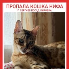 ПРОПАЛА КОШКА. Сергиев Посад, Кировка Пропала кошка бенгальской породы (окрас светло-коричневый). Отзывается на кличку Нифа. Возраст – год и 2 месяца. Пошла гулять около дома на ул. Луговая, 21, Кировка и не вернулась. Кошка очень добрая и имеет проблемы с развитием: не умеет высоко прыгать, не боится собак, не может огрызаться или убежать. Ест дома только сухой корм. Одна и сама на улице она просто не выживет ПРОСЬБА ПОМОЧЬ, ЕСЛИ ВЫ ВИДЕЛИ ЕЁ ИЛИ НАШЛИ – ЗА ВОЗНАГРАЖДЕНИЕ Сообщайте по номеру:.. (Евгения).. (Наталья)