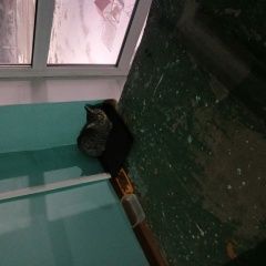 В подъзде сидит кот. Ухоженный, видно, что домашний. Крупный. Напуган.