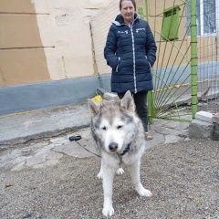 Найдена собака бело серый окрас очень добрая и воспитан