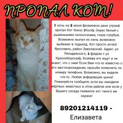 Потерялся кот Особые приметы: белый с рыжими полосочками, глаза голубые. Потерялся Заволгой в районе ул. Ляпидевского Помогите пожалуйста найти